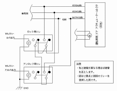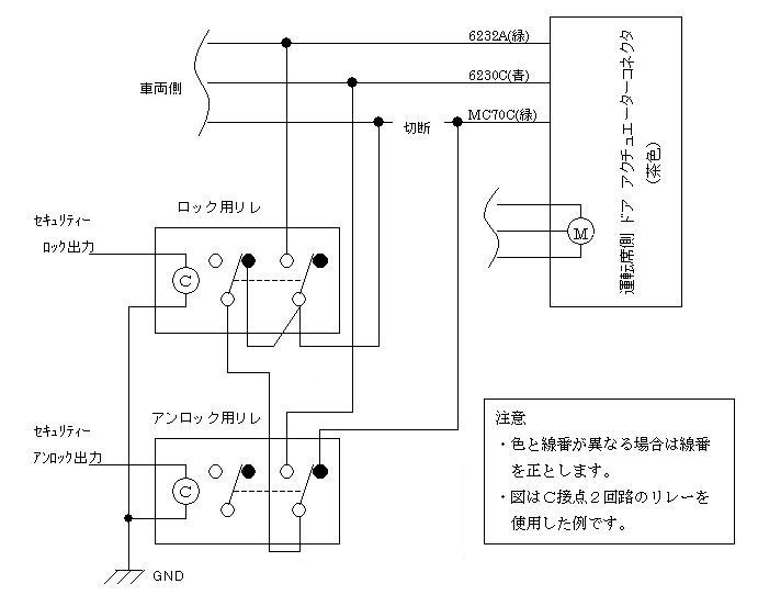 左の図がロック、アンロック連動の為に組んだ回路です。セキュリティーの出力でC接点2回路のリレーを動かしています。 ドアにキーを差し込んで回したときと同じ信号を入れてやることにしました。これができるのはマスターになっている運転席のアクチュエータだけです。 コモンである線番MC70Cの線をロック用とアンロック用のどちらかとショートさせれば良いのですが、そのままショートさせても動きません。 アクチュエータの接点が常にどちらかの配線をショートさせているからです。この接点を殺すためロック、アンロックの際はコモン線をアクチュエータから一時的に切り離します。 この方法であれば車はキーを使ってのロック、アンロックと同じ動作をしてくれます。よって、ハザードによるアンサーバックも、ドアミラーの格納も連動となります。又、本来のキー操作や純正キーリモコンの操作にも影響はありません。 (左の図はクリックすると拡大できます) |