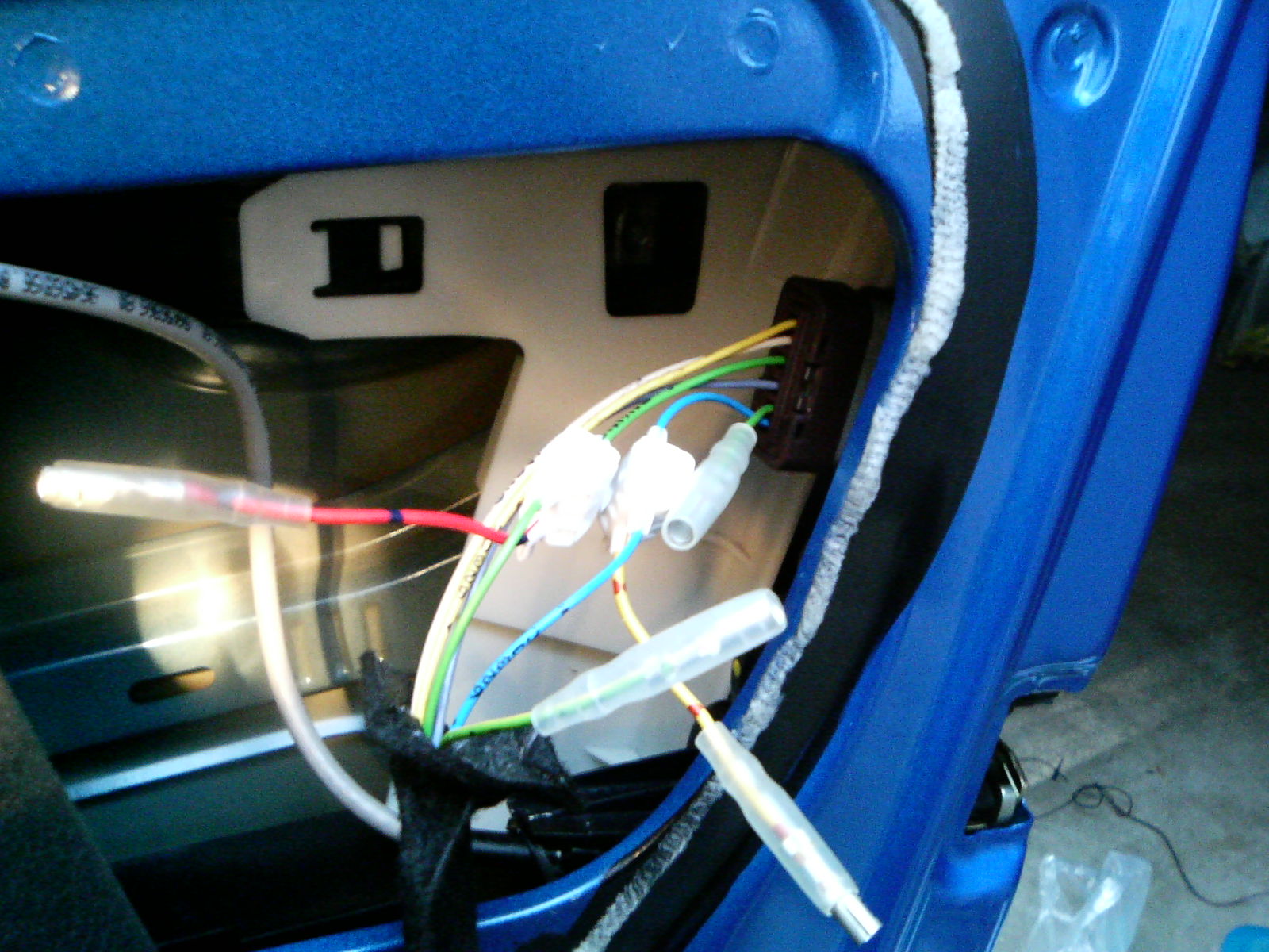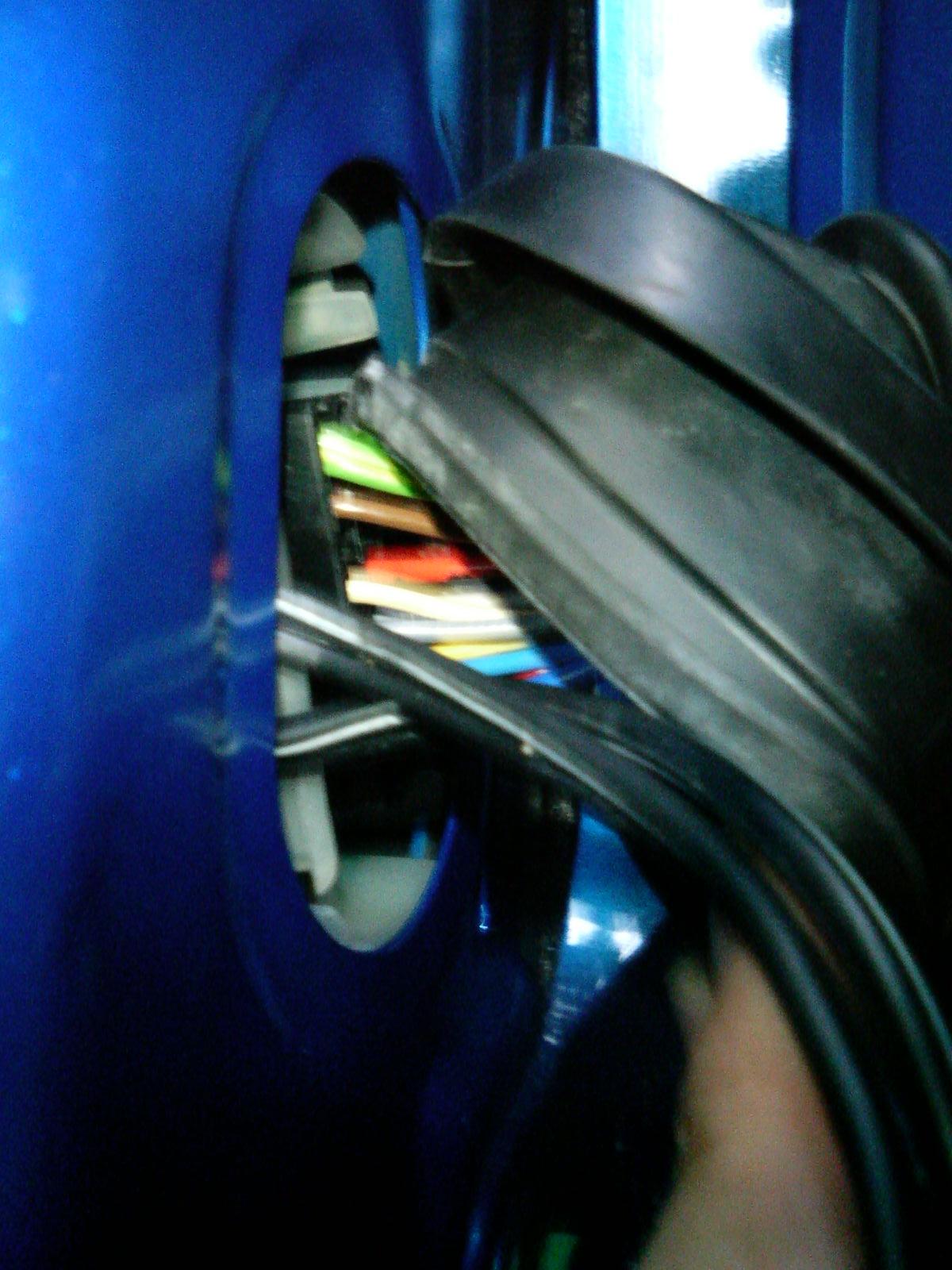 ドアから車体への配線通しです。左の写真はその間をつなぐゴムのジャバラです。 車体に入ってすぐのところがコネクタになっているようでした。その横から配線4本を通します。私は並行コードを2本使いました。 このゴムのジャバラを元通りにはめ直すのには結構苦労しました。車体側が非常にはまりにくい構造になっています。 |