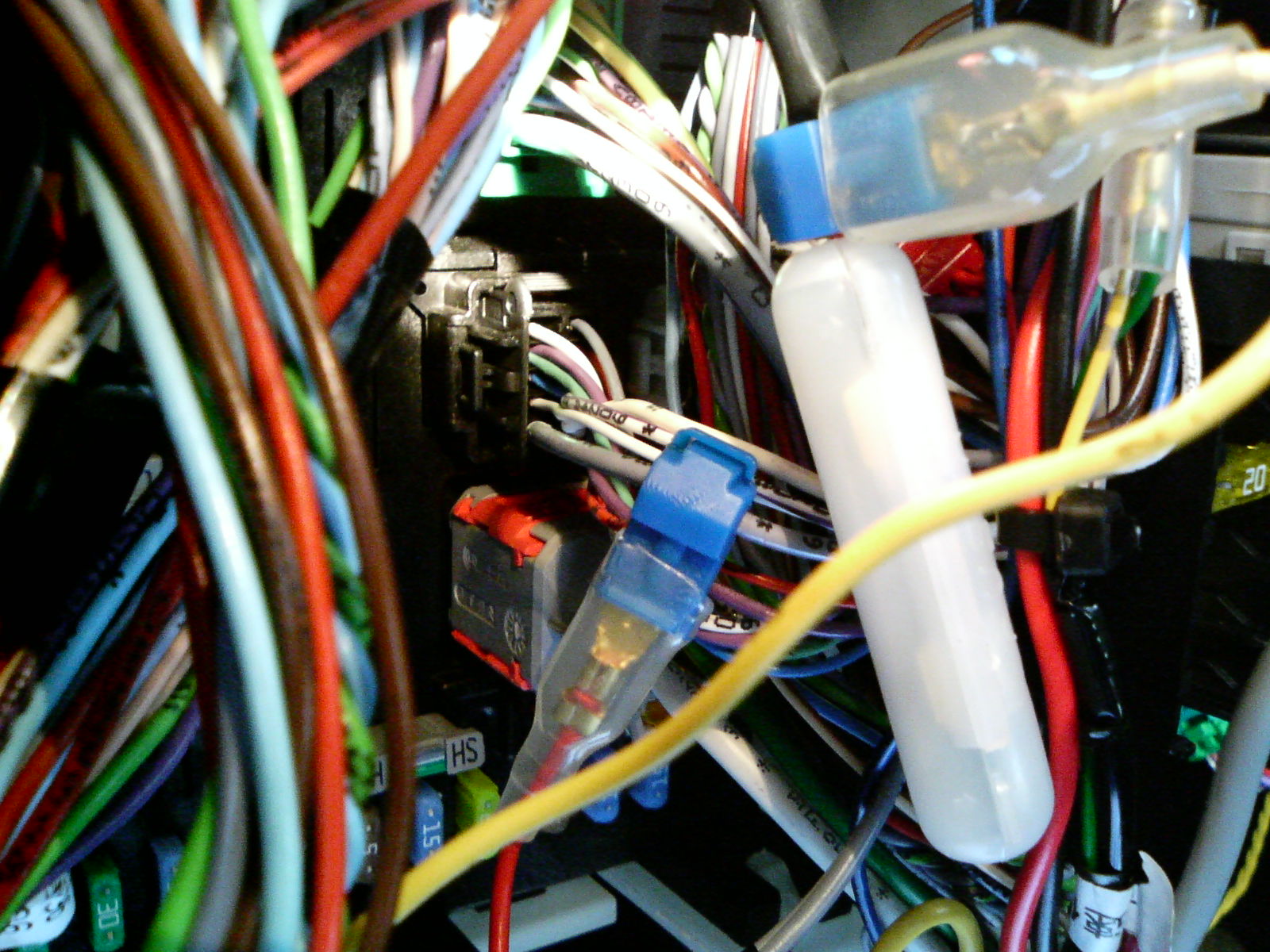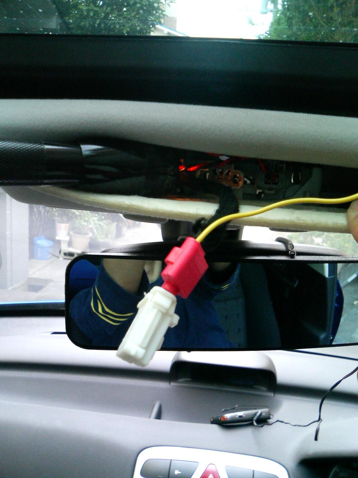 ■ドアスイッチの配線■ 次はドアが開けられたことを感知するINPUT DOOR SWITCHの配線です。 このセキュリティーのドアスイッチの配線は(−)インプットと(+)インプットがあり車に合わせていずれかを使用します。 国産車の場合によく使われる(−)インプットは、運転席のドアスイッチにつないでおけばドアが開いたときに配線がアースに落ちて警報がなります。ところが307SWにはこのドアスイッチがありません。 その代案としてドアが開いたときに点灯するルームランプと連動させることにしました。ルームランプ点灯時に+12Vが流れる配線を(+)インプットに接続します。 307SWはカギが開いた時点でルームランプが付くので、実際にはカギが開けられた時点で警報がなります。 万一カギを解除せずにドアが開けられたとしても、どのドアが開いたときにもルームランプが付くので必ず警報がなります。 結果的にドアスイッチよりもセキュリティーの強化となりました。(もちろんドアオープンでルームランプが付くようにしておくことが前提) 配線はフロントのルームランプから取りました。ランプのユニットの外し方がわからず、天井の内張りの隙間からコネクタを抜いて配線しました。 ランプのユニットにつながるコネクタは3つあり、真ん中のコネクタがルームランプです。コネクタがユニットに刺さっている状態で、向かって一番右側の線が+12Vでした。 写真は、そこにエレクトリカルタップをつないだところです。この配線をセキュリティーの(+)INPUT DOORSWITCHに直接つなぎます。 |