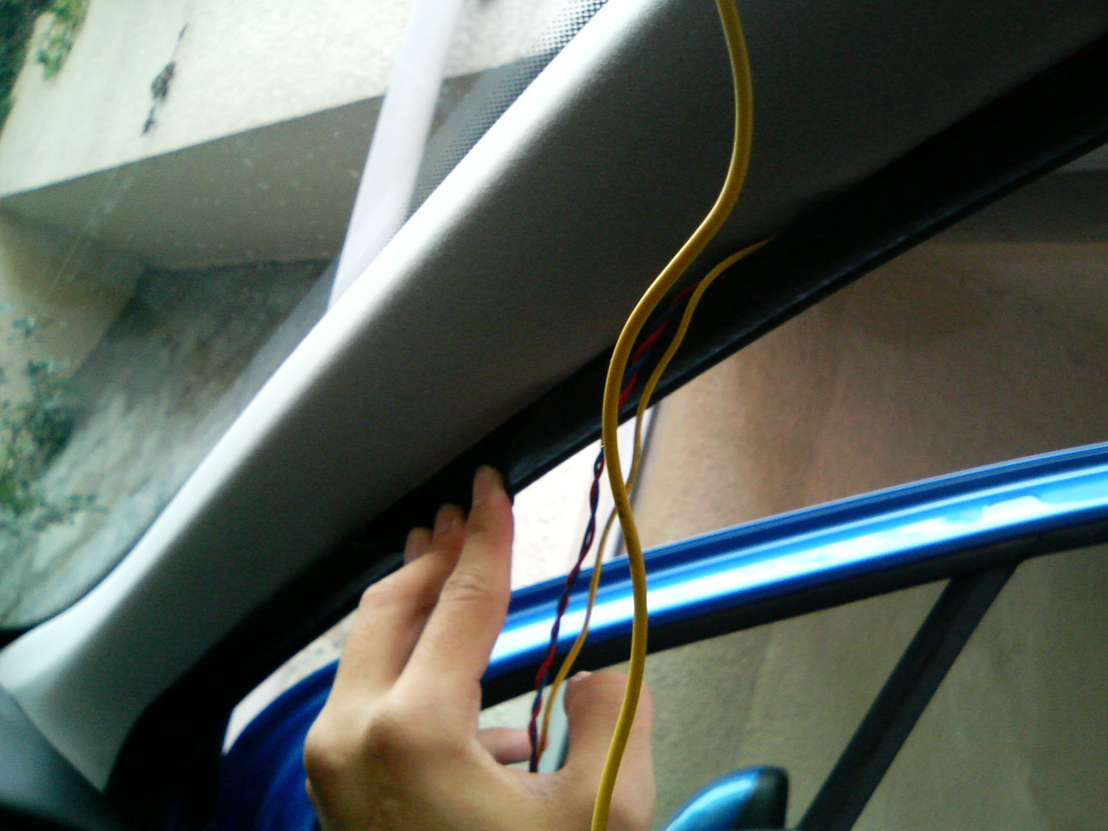 配線はAピラーの中を通します。Aピラーの中にはカーテンエアバックのヒモがあります。ヒモは左の写真で私の手が写っている辺りから上に伸びています。 配線を通す際はこのヒモよりも奥側に通すと万一エアバックが開いた際に妨げにならないと思います。 又は、手前側に通して十分に予長をとってやるのも良いかもしれません。いずれにしてもエアバックが開く際は内装を破って出てくるので、少々配線があっても引き出されるか、引きちぎられると思います。 ただし、確信は持てませんので、あくまで自己責任でお願いいたします。 この配線のついでに、セキュリティー本体から出ているLEDランプの配線もここを通しました。 フロントガラス上部にLEDランプを付けておくと、車外から見てもセキュリティーが働いていることを確認できます。 このLEDはセキュリティーが働いていることを示す他に、点滅パターンで警報がなっていたことも教えてくれます。 |