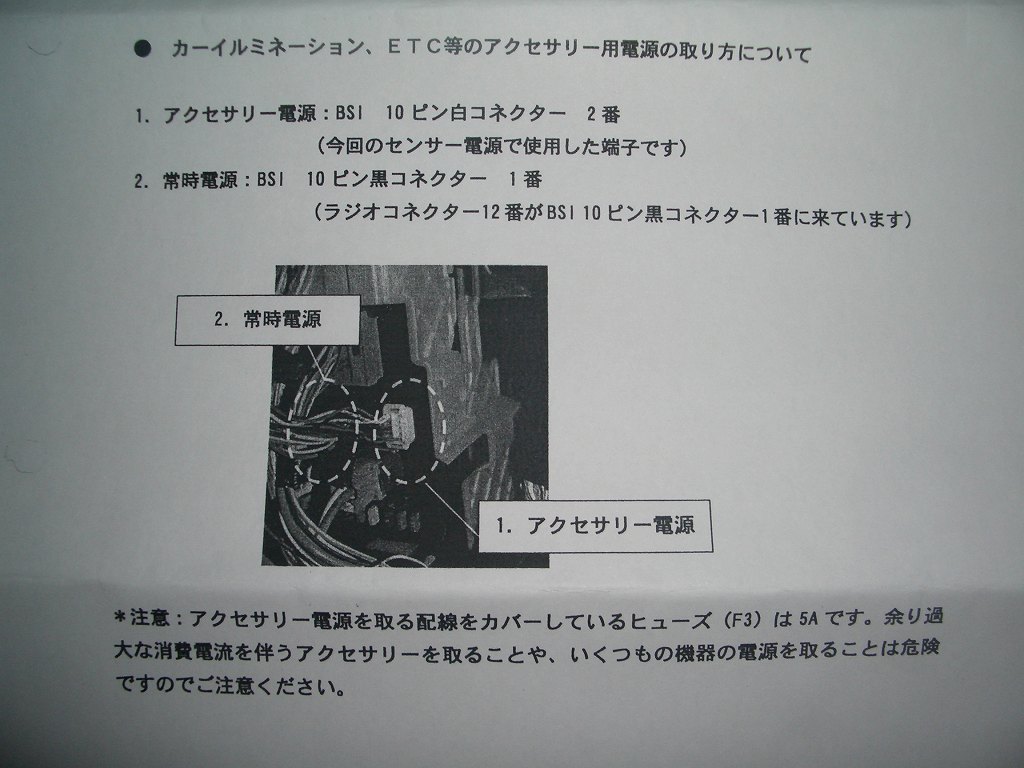 次は電源の確保です。次の3本を接続します。各配線名はセキュリティー本体裏側書かれた配線名です。 ・INPUT 12V POWER(常時電源12V) ・INPUT SWITCHED IGNITION(イグニッション検知) ・INPUT CHASSIS GRAND(アース) 上記のうちイグニッション検知は、本来エンジンがかかったら+12Vを出力する配線に接続するものですが、私はいつもACC(アクセサリー電源)で代用しています。 このセキュリティーでのイグニッション検知は、警告を発したことのメモリーをクリア、プログラムスイッチでの設定、リモコン無しでのアンロック操作などに使われます。 エンジンスタータ付きのものは、エンジンがかかったか否かを検知する必要があるのでACCでは代用できないものもあるかもしれません。 常時電源とACCの配線は、左の資料をもとに配線を探しました。(左の写真はクリックすると拡大できます) |