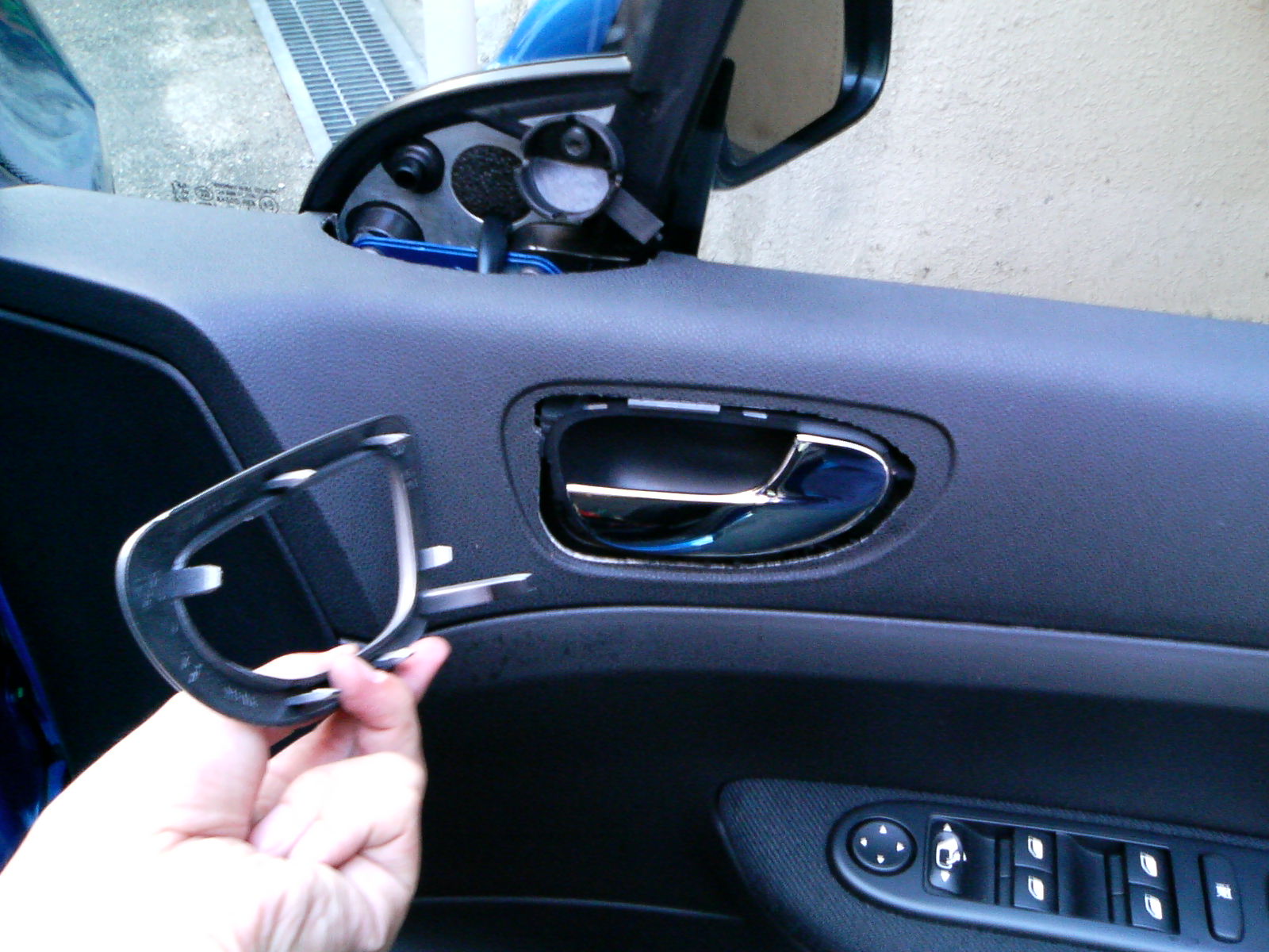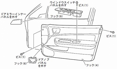 ドアミラーインナーパネル、はドアパネルを外す際に上方向に持ち上げる際にじやまになります。 ドアノブパネル、はドア本体に固定してあるパーツと噛み合い、ドアパネルを挟み込む構造になっています。 ひとつづつ丁寧に外して行きましょう。 この車はドアノブが完全にドア本体側に残ってくれるので、パネルを外すのが楽でした。 (どの車でもドアパネルを外す際、いつも一番面倒だったのがドアノブのワイヤー外しです。) |