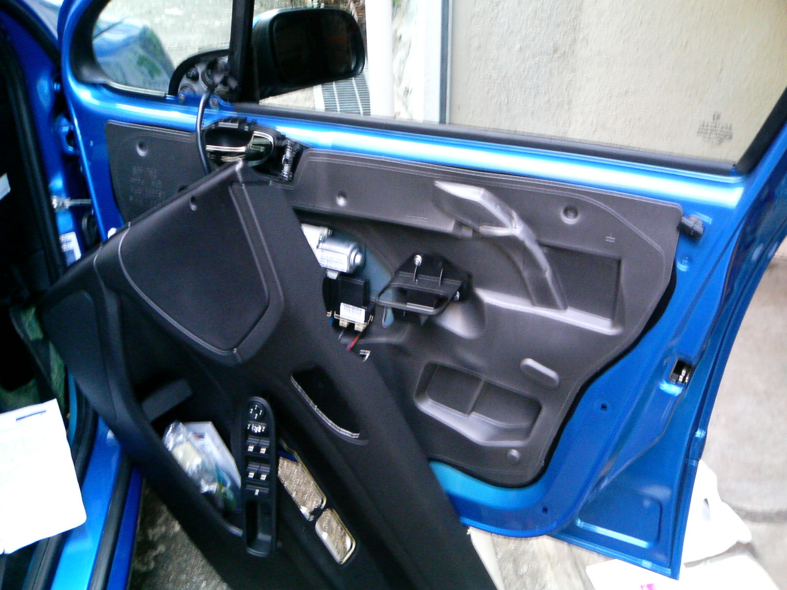 ドアパネルが外れたところです。 ドア内側にグレーのウレタンのようなものが貼ってあります。これが粘着力の強いガムのようなもので 貼られているので、カッターの歯を入れながら粘着剤を切って行きます。 戻すときは、もういちど貼り合わせれば元の通りに貼りつきます。 はがす部分は、ドアアクチュエータ付近と、車体へ配線を送りこむ辺りの2ヶ所です。あとは配線を通す際に必要に応じてはがします。 |
