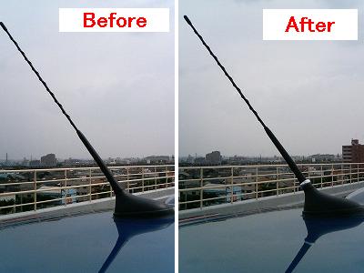 装着前後の写真です。いいアクセントになったと思います。 リングの形状はお好みで選びましょう。太さや色、重ね付け、着せ替えなどアイデア次第で楽しめます。 車に付けると雨ざらしになるので、あまり高価なものはもったえないですが、、。 |
