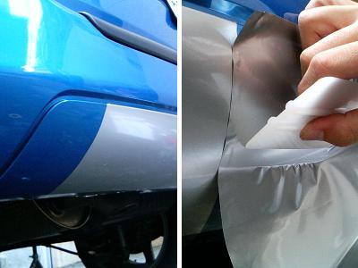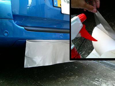 貼り付けは、センター部分1mと両端の3分割で行いました。 センター部分は広いので、水貼りで作業をしました。中性洗剤を少し混ぜた水を霧吹きで、バンパーとシートの両方に吹き付けておきます。 貼りたい部分よりも少しはみ出して仮付けをします。真ん中の上側から下および左右に向けてシートのシワを伸ばしていきます。 指やスキージで気泡(水滴)を逃がすように貼るのですが、バンパーには飛び石などで出来た小傷があるので、その部分はどうしても気泡ができてしまいます。 シートが貼れたら余分な部分をカッターで切り取ります。 気泡ができた部分は、カッターで少し切り込みを入れて空気抜き(水抜き)をします。この作業は根気がいるので一度にせず、時間があるときに少しづつ行うことにしました。 |