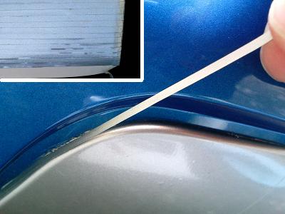 カッターで切り取った部分はどうしてもガタガタになってしまいます。また、シートが乾く途中でちぢんでくることもあります。 シートを貼って数日置いてから、端の部分に細く切ったシートを貼りました。 カッティングシートをカッターで細く切っておき、それをつないで貼っていきました。 |