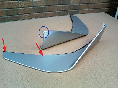 切断後、屋外用カッティングシートを貼ってシルバーにしました。 カッティングシートはリアバンパーのフィルムメイクで使ったものと同じシートです。 固定はバンパー下2点(赤矢印の部分)とフェンダー内側1点(青丸の部分)にしました。 先にカナードに穴を開けておき、それに合わせてバンパーを加工します。 |