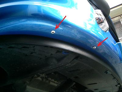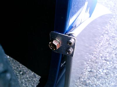 フェンダー内側との固定には、アルミ板を加工した金具を作りました。カナードの端面にビスと付けて金具を固定します。 (アルミ板はアルミペダルの取り付けであまったものです) その後、フェンダー内側に穴をあけてビスで固定しました。フェンダー内側にはモリーアンカーが付けられなかったので、ここはビスとしました。 ビスは頭が六角のものを使いました。これを使うとメガネレンチやスパナが使えます。ドライバーでしか回せないビスだと、脱着のたびにハンドル片側いっぱいに切ってタイヤをどけなければなりません。 カナードとバンパーの間にはクッショ付きの両面テープでゴムシートを貼り付けておきます。これを付けておかないと、走行中にこすれてバンパーが傷だらけになります。 |