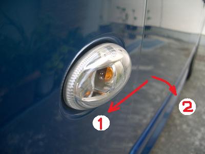 左の写真は純正サイドマーカです。オレンジのバルブが見えています。 最初に純正サイドマーカを外します。車両前方へ押しながら、押している方を手前に起こすと外れます。 |