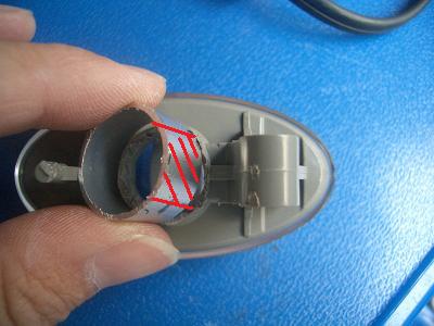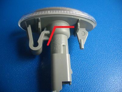 サイドマーカの裏側は写真の通りで、バルブが外せる構造にはなっていません。 赤い線のところで切断してバルブを取り出します。根元の太いところで切断しなければ中のバルブは抜けません。バネになっている部分を残すように切りましょう。 |