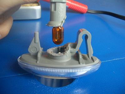 このLEDバルブはT10球よりも背が低かったので、このままでは奥に入りすぎています。 LEDバルブの頭がもう少し出るように、ソケット側を削りました。 良い高さになればソケット側とサイドマーカ本体を接着します。 |