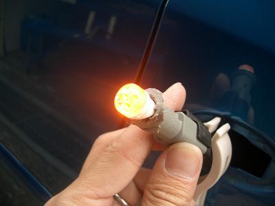 車両のコネクタにつないでLEDバルブの極性を確認します。 ハザードを付けて点灯を確認します。点灯しない場合はLEDバルブの端子が逆になるよう差し替えます。 点灯を確認したら、マジックでLEDバルブとソケットの両方にしるしを付けておきましょう。 後の作業でLEDバルブを抜いた場合でも、しるしを付けておくと点灯する向きが分かります。 |