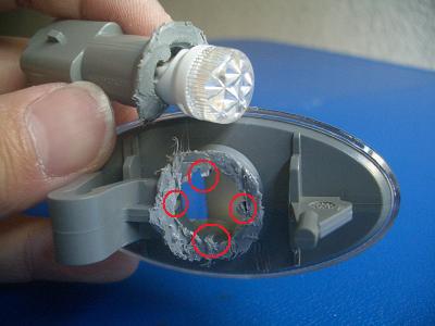 LEDバルブをサイドマーカ本体に入れます。 このLEDバルブは頭の径がΦ12です。そのままではサイドマーカ内側のリブ(写真の赤丸部分)がじゃまになります。 このリブをヒートカッターで切り取ります。 とけたてはみ出した樹脂も切り取ってきれいにしておきましょう。 |