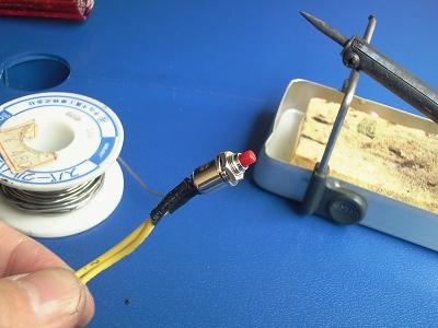 ホーンスイッチにはあらかじめ細い電線を半田付けしておきます。 端子どうしの隙間が狭いので、端子部分は熱収縮チューブで保護しておきます。 熱収縮チューブは100均ショップで買いました。 |