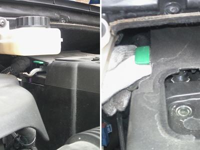 ハンドル部分を分解する前にバッテリーのマイナス端子を外します。MC後307の場合は車のコンピュータに影響を与えないよう次の手順で行います。 ボンネットを開けた状態にして車のドアをしめます。ルームランプやメータパネルのランプが全て消えてから4分待ちます。その間はドアの開閉など、車のセンサーが働くことは一切行わないようにします。 ボンネットを開けるレバーを引くためにはドアを開ける必要があるので、必ず4分を数える前に開けておきましょう。 4分以上が経過したら、バッテリーカバーの下にある緑色のレバーを上げてマイナス端子を外します。バッテリーカバー上部にある液量点検用の小さなカバーを外して端子を覗きながら作業をすると楽です。 エアバックを外す作業をする場合は、バッテリーを外してからさらに10分経過を待ちます。 |