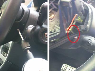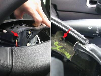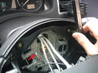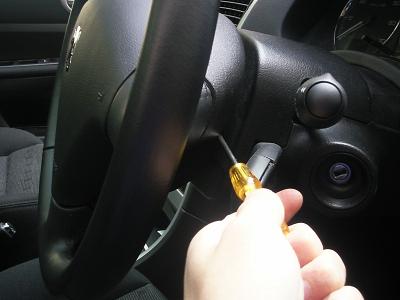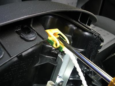 ハンドル中央部のエアバックを外します。写真のように、ハンドル横の穴に細いマイナスドライバーを先が水平になる方向で差し込みます。 バネを押しているような感覚があるので、それを押しながらエアバックを手前に引っ張ります。 それを左右とも行うとエアバックが外れます。 |