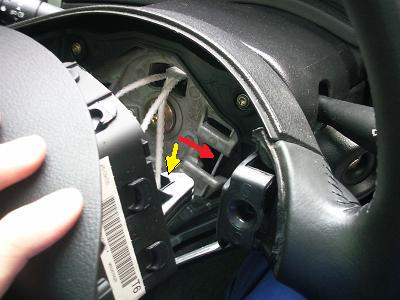 エアバックが外れたところです。 バネを押すような感覚は赤矢印のワイヤーを押していた感覚です。 そこに黄矢印のツメが引っかかってエアバックが固定されています。 他の部分は全て樹脂のツメで引っかかっているだけなので、手前に引っ張ると外れます。 |