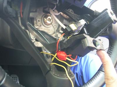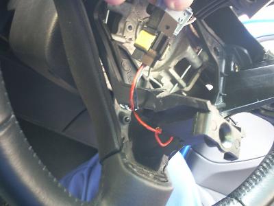 ハンドルの下側のスポークになる部分に、ホーンスイッチの配線があります。 車体側からの配線とハンドル内の配線をつなぐコネクタがあるります。この配線に新設スイッチの接点をつなぎます。 コネクタはハンドルにツメでとまっているので、それを外すと配線がさわりやすくなります。 赤い線と黒い線があり、黒い線は先ほど外したアース線にです。 |