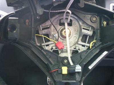 アース線側は、トルクスネジで固定されている端子の近くに接続しました。 その後、外したのと逆の手順で黒い可動部を取り付けます。外したバネを裏側に挟むのを忘れないようにしましょう。 ホーンスイッチのコネクタも元の場所にはめ込みます(写真下側) 新設スイッチの配線は、エアバック取り付けの邪魔にならないよう、黒い可動部の裏側に入れておきましょう。 ネジの閉め忘れや配線のつなぎ忘れが無いかを確認して、エアバック部分を取り付けます。 エアバック部分は上から押し込めばはまります。 |