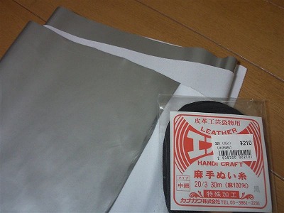 ユザワヤで、写真のようなものを購入しました。 シルバーの合皮1.5mx0.3mと、黒の中細麻手ぬい糸です。合わせて800円弱で購入しました。 このシルバーの合皮は、エナメルという名称で合皮コーナに売られていたものです。 光沢があり、伸縮性の素材です。見た目はまるでシルバーフィルムのようです。 |
