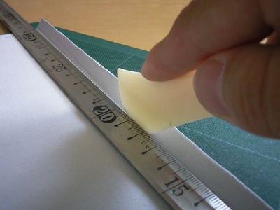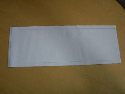 合皮を120mmX330mmに切断します。 合皮が伸びる方向を長手方向にとります。 上下を10mmづつ、左右を5mmづつ折り込んで、仕上がりが100mmX320mmとなるようにします。 折る部分には鉛筆か細いマーカで線を入れておきます。 |
