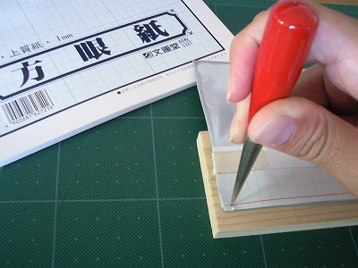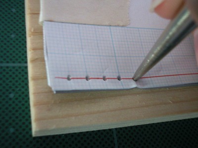 折り目が戻らなくなったら、目打ちを使って縫い穴を開けていきます。 上下ともに同じ間隔で同じ位置に穴をあけます。 穴の位置は、方眼紙を使って、マス目に沿って穴を開けていきます。 合皮の端から3mmの部分に線を引き、その受けを5mm間隔で穴を開けました。 方眼紙はマスキングテープなどで合皮に貼り付けておくとよいでしょう。 目打ちの台にしたのはカマボコ板です。 |
