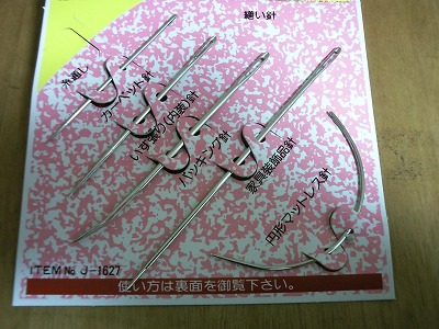次は麻手ぬい糸を使って合皮をハンドルにつける作業です。 ここでは写真のような太めの針を使います。 ストレートの針2本、円形針1本があると便利です。 |