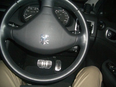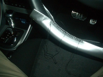 ハンドルに合皮を取り付けます。 ハンドルを180度反転させた状態にすると作業が楽です。 この状態にしてエンジンを切ってしまいましょう。 (ハンドルがロックされている状態にします) |