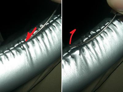 センター部分から外側にむけて糸をしごいていきます。 写真のように円形糸を使って、糸を1本づつすくっていきます。 すくった糸を強く引っ張って、締め上げます。 これをセンターから左右外側へ、1本づつ行います。 この作業を2〜3回行います。 ここでしっかりと糸をしごいておかないと、運転中に合皮ずれて危険です。 合皮がシワになった部分はセンターから外側に引っ張って伸ばしていきます。 最後に左右両側の糸を縛って、あまった糸を切断します。 このとき、糸を少しのこして合皮の内側に押し込んで、端をかくすとよいでしょう。 |