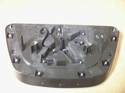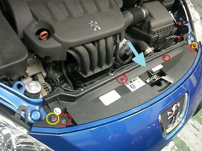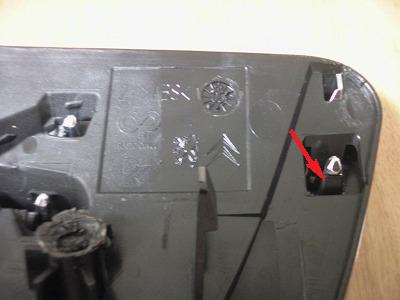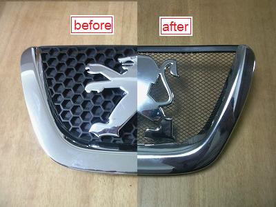 メッキパーツを固定しているツメを外します。 ツメを引っ掛けている板を細いマイナスドライバーなどで倒して折ります。 全ての固定を折ればメッキパーツは外れます。接着剤などは使われていませんでした。 (PSAだけにプジョーとシトロエンのエンブレムが刻印されています。ぜったいシトロエンには使わないパーツなのに。) |