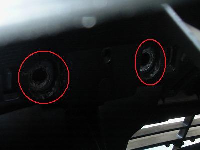 前項の水色矢印の方向から中を覗いたところです。 エンブレムの裏側の2ヶ所の固定をニッパーなどで切断します。 (これも後から撮った写真です。切断後の写真でスミマセン。) |