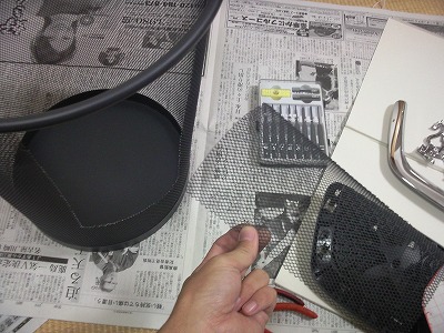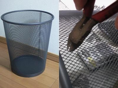 金網の材料として選んだのはIKEAで買ったゴミ箱です。 ニッパーで金網を切断して、エンブレムより一回り大きいサイズにします。 |