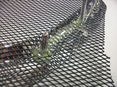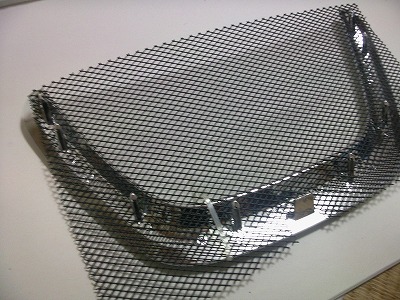 エンブレムの枠のに金網を重ねます。 枠の裏側のツメを通す穴をニッパーで開けます。 写真は穴にツメを通した状態です。インシュロックを使って仮り止めしておきます。 |