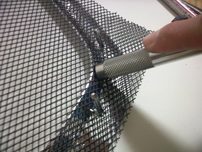 金網が枠になじむように整形していきます。 ラチェットハンドルやドライバーの持ち手などで、金網を枠に押し当てて形をつくります。 |