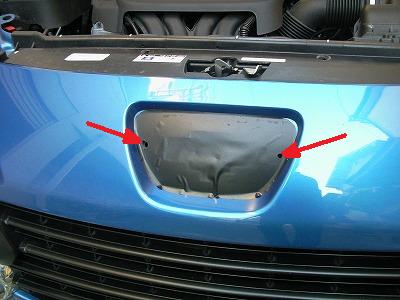 バンパーからエンブレムを外した部分には歪な穴が開いています。 また、そのままでは金網の奥にボディー色が見えてしまうので黒いカッティングシートを貼って目隠しをします。 後でエアインテークの加工をするつもりなので、かなり適当に貼っています・・・。 エンブレムにつけた固定用のネジに合わせて、バンパーに2ヶ所の穴を開けます。 |