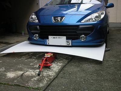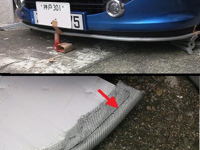 最初にフロントバンパーのボトムラインを型取ります。 ホームセンターで「プラダン」という名称で売られている板を使用します。 樹脂で作ったダンボールで、写真の大きさのもので800円ほどでした。 プラダンをバンパーの下に敷き、適当な箱などを並べて高さをバンパーに合わせます。 |