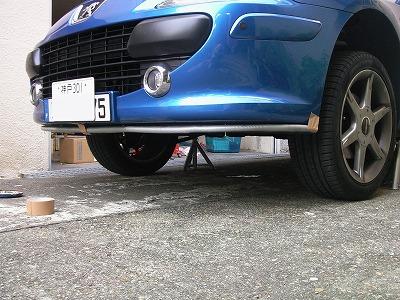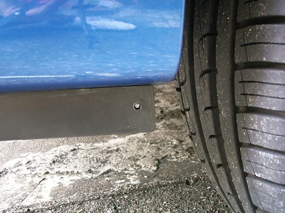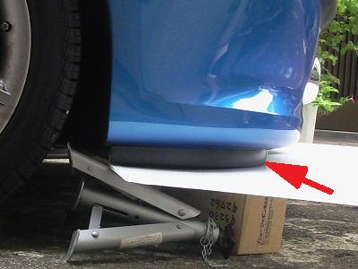 車をジャッキアップして、作業しやすい状態にしておき、スポイラーをガムテープで仮止めします。 固定位置が決まったら、ドリルビスを強くバンパーに押し当てて回し、取り付け穴を作ります。 |