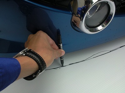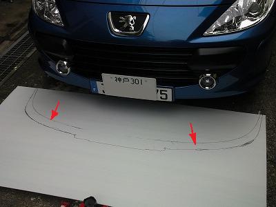 上塗りが硬化したら、バンパーの下にガムテープで固定し、デフレクターのラインをけがきます。 ちょうどカブセールとプラダンの接合部がデフレクターのラインとなるはずです。 |