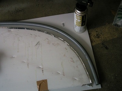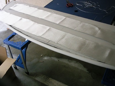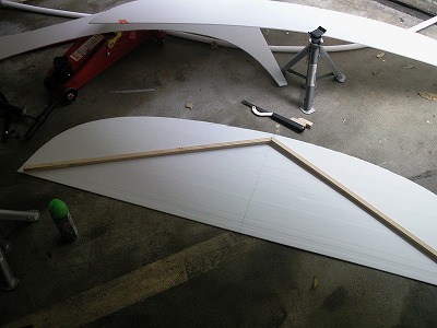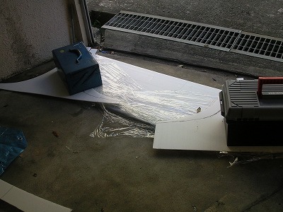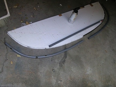 プラダンの先にカブセールを両面テープで固定したところです。 カブセールの長さが2mなので、プラダンからはみ出すサイズでしたが、両側が均等にはみ出るように中心を合わせて固定しました。 FRPが硬化するまでの間だけ、プラダンからカブセールが外れなければ良いと軽く考えていました。それが失敗でした。 後でFRPが硬化する際にカブセールが外れて歪んでしまったのです。 固定は接着剤などを使い、しっかりと外れないように固定すべきだったと反省しました。。。 以降文中では、プラダンとカブセールで使ったものを「型」と呼ぶことにします。 |