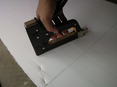 角材を付けたプラダンをひっくり返し、タッカーを打ち角材を固定します。 角材を固定したら、角材をはさむようにして、もう一枚のプラダンも同じ要領で固定します。 |