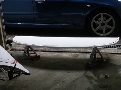パテが固まったら、前作のスポイラーと同様に、FRPを巻きます。 写真は硬化中に撮ったものです。 上に乗っているのが先に作ったスポイラーです。 坂道で擦って割ってしまったので車体から外しました。 心材が硬いので、硬化中に歪むようなことはありませんでしたが、結局このスポイラーは装着しませんでした。 作っているうちに、飽きてしまいました。 最終的には、シルバーではなく黒いものを付けようと思いDIYコーナNo.40のアンダーガードを付けました。 |