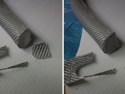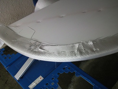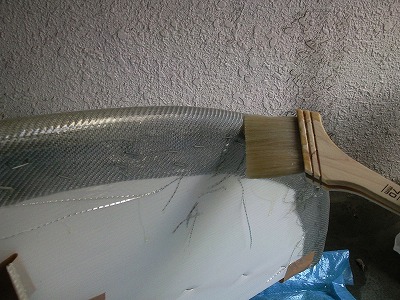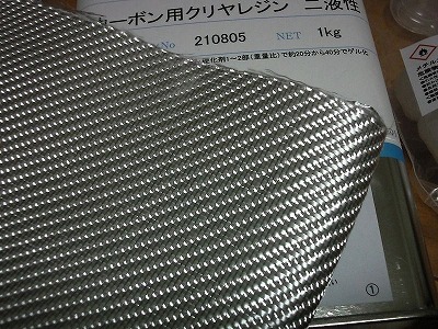 型が出来たら、次はFRPの施工です。 ガラス繊維のシルバークロスは1200mm×500mmのものを購入、樹脂はカーボン用クリアレジンという透明度の高い樹脂を使用しました。 ネット通販で購入しクロス、レジン、送料、代引き手数料を合わせて6、575円でした。 一般的なガラスマットやガラスクロスよりは高価ですが、後で塗装をしなくても済むので、トータルコストで安くすみます。 また、FRP製作後にシルバーカーボン調フィルムを貼ることも考えましたが、フィルムの方が本物よりも高価でした。 |