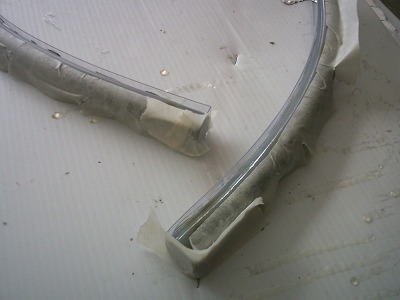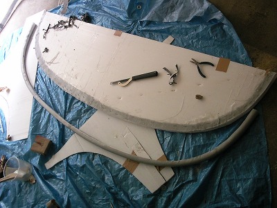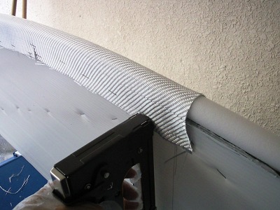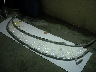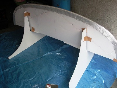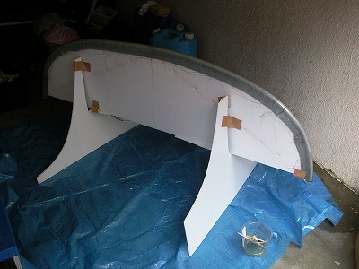 両端の部分をシルバークロスでふさぎます。 型に残った平らなFRPの一部を切断し、両面テープで貼り付けます。 そのうえに、さらに樹脂を塗って固定します。 この部分は強度はありません。あくまで見た目だけの為です。 |