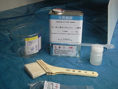 カーボン用クリアレジンと硬化剤を調合します。 レジンと硬化剤は100:1の割合で調合します。 レジンを約300cc使いました。 容器や刷毛はホームセンターや100均ショップで安いものを購入しました。使い捨てが前提です。 本来ならば、使用後はアセトンで樹脂をふき取り再使用するのですが、一度限りの作業であれば、アセトンを買うよりも使い捨ての方が安くなります。 |