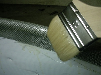70mmの刷毛で樹脂を塗っていきます。 クロス全体が湿るように塗ったあと、さらに樹脂を重ね塗りします。 |