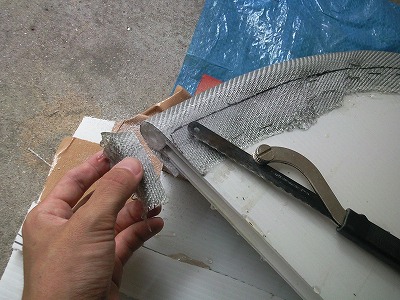 シルバークロスを切断します。 長さが1200mmなので、2枚を中央でつぐことにしました。 500mm幅を4等分して約120mm幅に切断しました。 切断するときに、細かいガラスの繊維が飛び散りますので、手に刺さらないようビニールの手袋をして作業をしました。 当然ですが、体内に吸い込んでしまわないよう気を付けましょう。 |