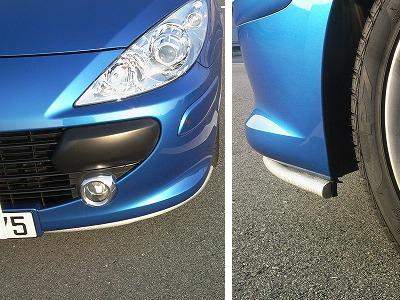 バンパーに取り付け穴があいたらスポイラーを外し、上面に両面テープを貼ります。 バンパーの両端部分は、バンパーとデフレクターが近く、この方向では両面テープがつかえません。 |