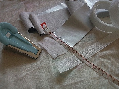折しろの部分は、折り返して「アイロン接着テープ」というもので接着することにしました。 ミシンで縫っても良いのですが、縫い目を外に出したくなかったことと、テープの方が早くて簡単なので、この方法を選びました。 写真の「アイロン接着テープ」は100均ショップで見つけたものです。 |