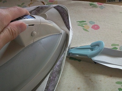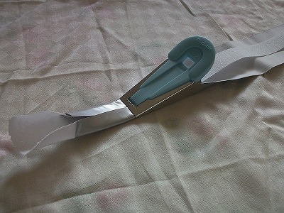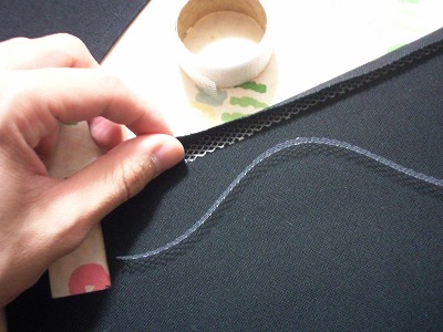シルバーラインの端は、裏側部分を切り取って、内側に折り込んで、これも「アイロン接着テープ」で接着します。 |