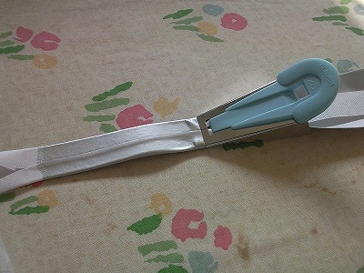 テープメーカは布で熱接着バイアステープを作るものですが、コレを応用して本来とは違った使い方をします。 上側にテープを付けるのではなく、生地の中に差し込む形にセット、織り込んだ側を固定してテープ形状を作ります。 アイロン糊付きテープは糊面を上側にして、折り返した側が貼りつくようにしました。 |